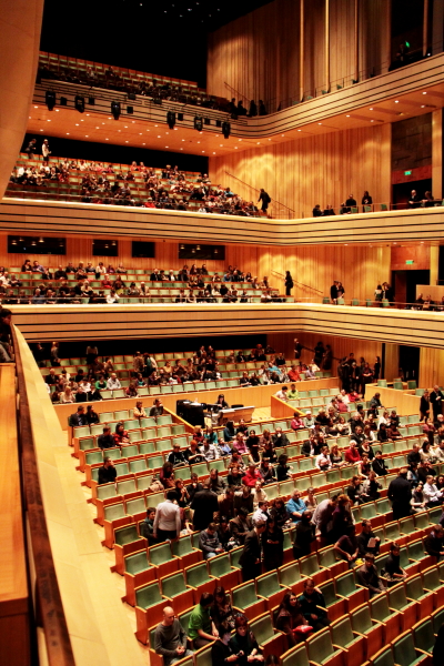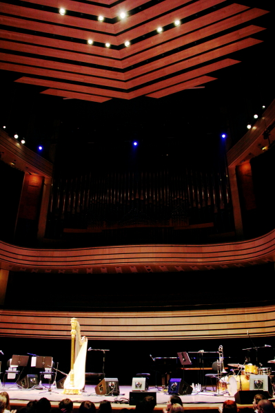 Pojawiło się kilka numerów z debiutu - dyskretne Clam, Crab, Cockle, Cowrie i wyraziste Inflammatory Writ, w którym suchy klawesyn został zastąpiony mocnym groove', fortepianu i gitary. "Ys" reprezentowały zaś dwa utwory - Cosmia i przyspieszone Monkey & Bear. Jeśli coś mnie rozczarowało, to właśnie ten ostatni utwór, któremu zabrakło suspensu. Z nawiązką wynagrodziły to jednak bisy - najpierw niespodziewane, nieplanowane i fantastyczne Coleen, a na sam koniec Peach, Plum, Pear, o nieco innym kolorycie niż w wersji studyjnej - imponująca harfa wytrzymała dłużej niż standardowe, jednak w tym momencie była już rozstrojona i większy ciężar melodyczny spoczął na barkach Francescioni'ego. Jego skromne aranżacje przekonały mnie zresztą bardziej niż na pierwszej trasie po premierze "Have One on Me", być może okrzepły z czasem. Szczególną rolę pełni w nich Morgan, grający na perkusjonaliach niewiele, ale w swej zwięzłości doskonały i bardzo melodyczny. Pięknie było, ot co, a salę niemal całkowicie wypełniła publiczność zróżnicowana i wiekowo i etnicznie - zjechały się chyba całe Austro-Węgry, często też słychać było angielski. Załączamy też kilka zdjęć obiektu, bo jakby jeden taki zamiast kilku stadionów w Polsce wybudować, to by nam się żyło lepiej.