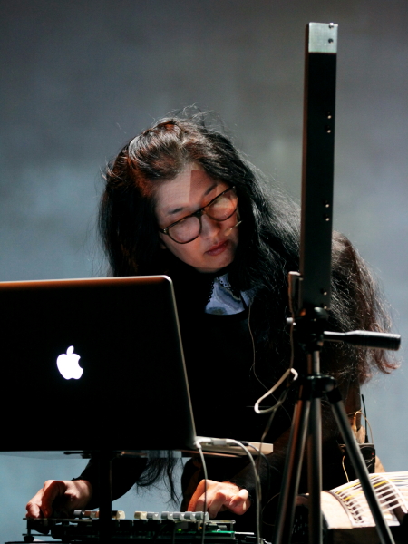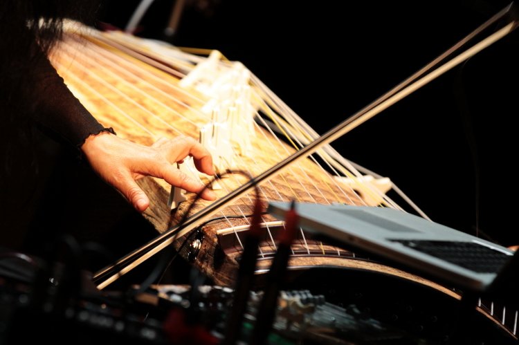 Zaczęło się od muzyki na koto i pomoce, a tak w ogóle to od nastrojenia kamertonem sali. Później usłyszeliśmy dwa utwory na koto i elektronikę oraz jeden na koto i jego laserowo-cyfrowy odpowiednik, którym towarzyszyły wizualizacje Roberta Bęzy. Laptop był potrzebny dla monochromatycznych plam i oscylacji, wokół których przebiegały dźwięki koto, które okazało się dość suchym instrumentem, przy grze smyczkiem wdającym się w dialog szarych mgieł z laptopem. Szczególnym przeżyciem było obserwowanie gry Masaoki na laserowym quasi-koto, umieszczonym przed koto prawdziwym i prostopadle do niego. Ponieważ nie było widać wiązek, z którymi powiązane były sample w laptopie (najpierw elektroniczne, później przypominające dźwięk zwykłego koto), to performans artystki zdawał się spełnieniem marzeń każdego dzieciaka, wycinającego ulubione hity na nieistniejącej gitarze albo fortepianie.