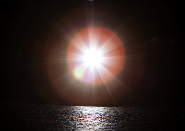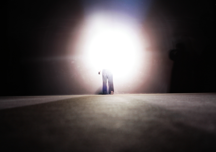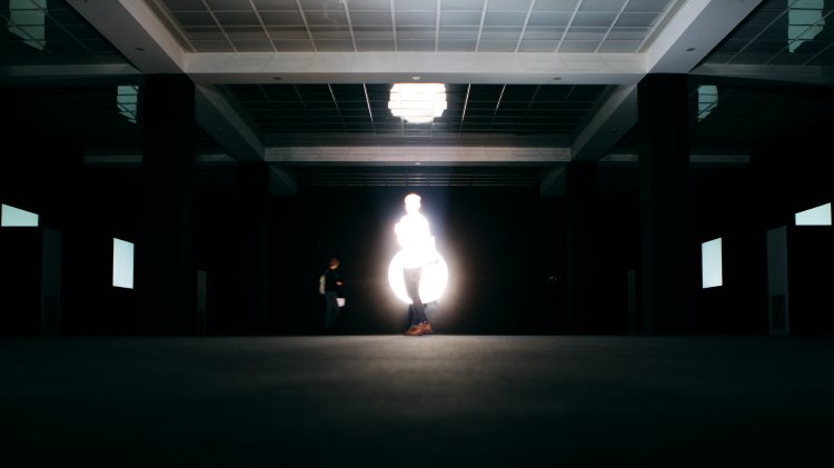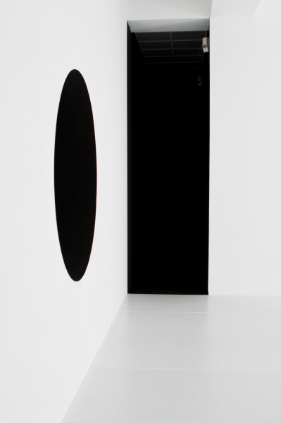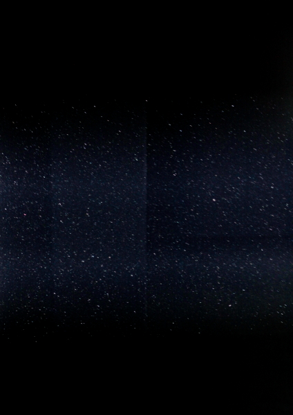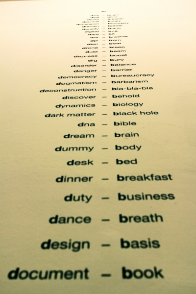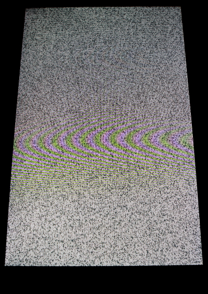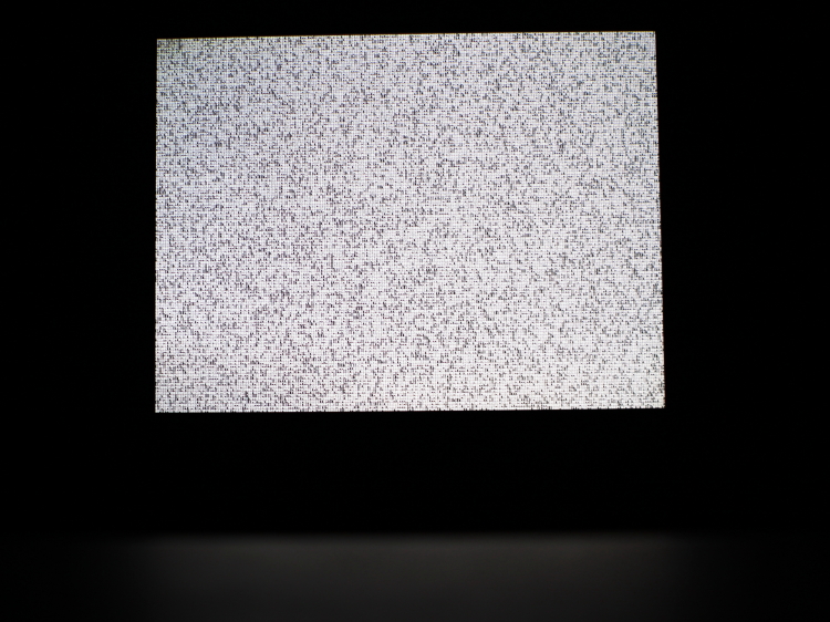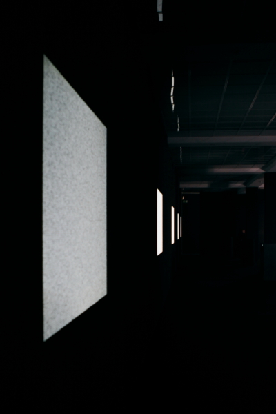 Przedostanie się do sali wschodniej wymaga przejścia przez inne ekspozycje, hall, itp., przez co trochę z tego temporalnego zawieszenia się wypada. Dobrym łącznikiem okazują się jednak identyczne tablice z parami słów, znajdujące przed obiema salami. W tej wschodniej znajdujemy negatyw wcześniejszego doświadczenia. Jej czerń jest rozcięta potężną wiązką białego światła, na białych panelach panuje cyfrowy chaos przeplatany krótkimi epizodami uporządkowania. Dźwięku praktycznie nie ma, choć z projektorów dobiegają rytmiczne cykania a la "Test Pattern" Ikedy. Za ścianą z okrągłym otworem kryje się mała sala w bieli, to w niej słup światła znajduje swój rzut na płaszczyznę. Tutaj modyfikacje przestrzeni przez poszczególnych widzów są widoczne dla wszystkich, a fakt, że w białej fali kryje się całe spektrum barw jeszcze łatwiej zrozumiały i bezpośrednio widoczny na cyfrowych zdjęciach (a propos, wybaczcie brak statywu). W efekcie, "db" okazuje się realizacją komunikatywną, przekonującą i wręcz zaskakującą swą prostotą. Obejrzeć, usłyszeć i przeżyć można ją do 9 kwietnia.