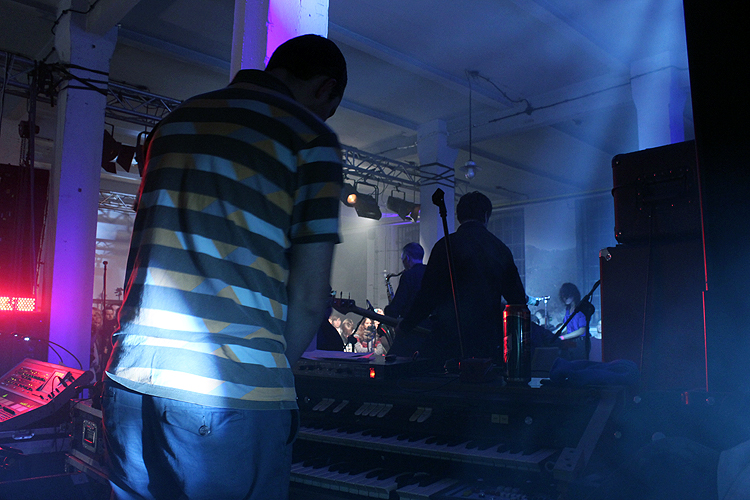 Punkt o północy na scenie zainstalowało się Pure Phase Ensemble, czyli zespół będący efektem kilkudniowych warsztatów. W porównaniu do ubiegłorocznej edycji było głośniej, intensywniej i krócej, przez co występ zdecydowanie zyskał, nie nużąc ale umiejętnie prowadząc narrację, mimo że w wielu momentach opartą na improwizacji. Muzyka miała mnóstwo przestrzeni, w wielu momentach była oparta na narastających, spójnych crescendo, łączących wszystkie instrumenty, ale w równie często przymowała rockową estetykę z hałasującymi w tle talerzami. Minusem koncertu był potężny hałas, który generowała muzyka, nie zawsze najlepiej nagłośniona. Gubiły się trochę niektóre partie instrumentów, zagłuszone przez inne. Ale nie zabrakło muzycznych smaczków. Skrzypce Macieja Wojnickiego (Mananasoko) i rytm wybijany na własnoręcznie stworzonych przetwornikach, ciekawie rozpoczął jeden z utworów. Klawisze Oli Rzepki (Drekoty) fantastycznie wlewały się jako plamy dźwiękowe na gęstą magmę spinającą brzmienie saksofonu Raya Dickatego oraz gitar Macieja Minikowicza, Łukasza Piotrowskiego i Artura Bieszke. Steve Hewitt za perkusją przesadnie nie zachwycił i pozostało tylko żałować, że na scenie nie starczyło miejsca na drugi zestaw dla Oli Rzepki (w jednym z utworów chwilowo tylko na nim poimprowizowała), wtedy koncert z pewnością by zyskał. Ciekawym brzmieniem charakteryzują się organy Rafała Wojczala, który wykorzystuje je w Trupa Trupa, jednak tutaj były skutecznie zagłuszane przez resztę instrumentów, tylko w jednym momencie stanowiąc wiodącą linię. Finalnie występ trwał nieco ponad 30 minut i wypadł świetnie, przestrzennie, więc należy czekać na rezultaty w postaci drugiej płyty PPE, oby wydanej przez Nasiono Records jak najszybciej.