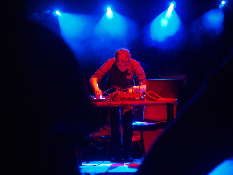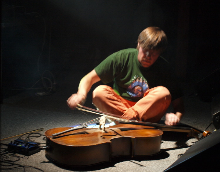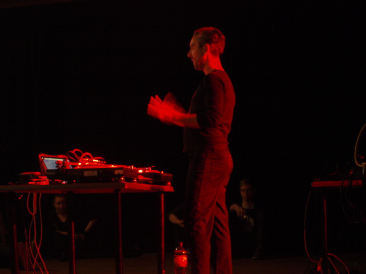 Ich występ miał miejsce w części kawiarnianej klubu, jako pierwszy w głównej sali zaprezentował się Adam Webster. Grał na wiolonczeli wykorzystując też looper, nie wydaje mi się, żeby na bieżąco kontrolował jego działanie - ustawione było chyba stałe opóźnienie, które pozwalało mu niejako improwizować z samym sobą. Zaczął spokojnie, od pojedynczych dźwięków, delikatnego uderzania smyczkiem strun, stopniowo grał coraz więcej i głośniej. Dość szybko przeszedł do instrumentalnego rozgadania, brakowało mi w tym występie zróżnicowania, może momentu zatrzymania, zagrania ciszą. Albo jakiegoś pomysłu na formę, ten był, ale w aspekcie poza dźwiękowym: próba przełamania schematu “zwykłego” występu - siedzenie na podłodze, a na koniec położenie się. Był to jedyny koncert, w którym pojawił się instrument i może szkoda, że nie był on przewidziany później, ciekawie mógłby zadziałać między całkowicie elektronicznym występami, na zasadzie kontrastu.