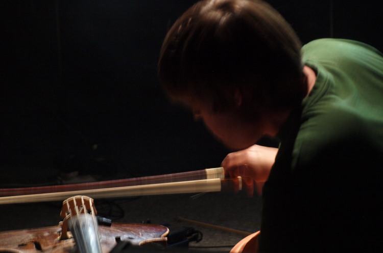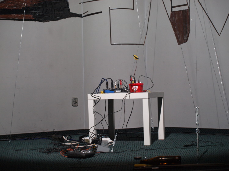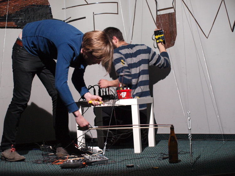 Festiwal poprzedzał panel dyskusyjny na temat krytyki w muzyce. Szkoda, że rozpoczął się o 13:00, a nie bezpośrednio przed koncertami, gdyż słuchacze niezbyt dopisali... Niemniej rozmowa ciekawie się rozwinęła, będą kontynuacje. Część muzyczną rozpoczął dźwiękowy performance “Ściana dźwięku” czeskiego duetu - braci Jakuba i Matěja Franków. Swoją instalację zbudowali z dwukolorowej taśmy magnetofonowej i różnej grubości drutów, zamocowanych przy podłodze bądź ścianach. Matěj miał przyczepione do dłoni dziwne urządzenie, którym ‘szurał’ po poszczególnych fragmentach taśm - czarnej (bardziej wyrazisty, brumiący dźwięk), brązowej, prostych, bądź naklejonych na siebie, pofałdowanych (nawarstwiające się szumy). Jakub natomiast przeciągał to smyczkami, to butelką po metalowych drutach niczym strunach, a czasem wprawiał je w drgania szarpiąc palcami.