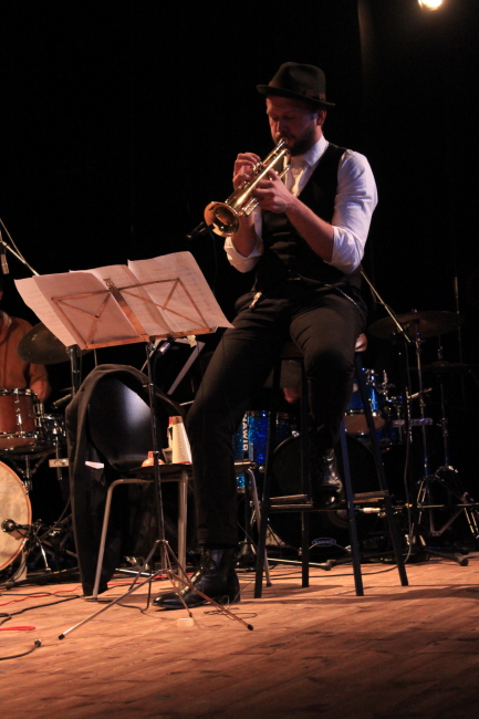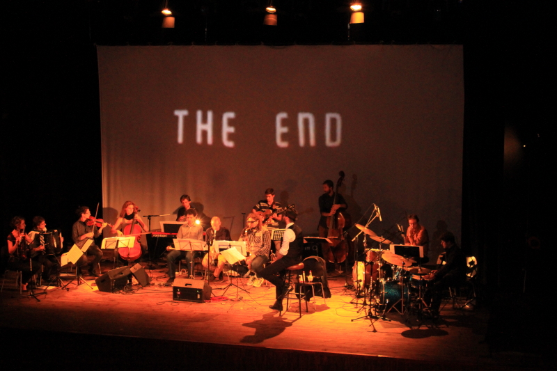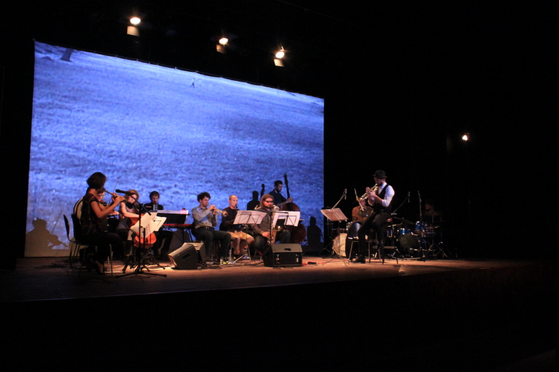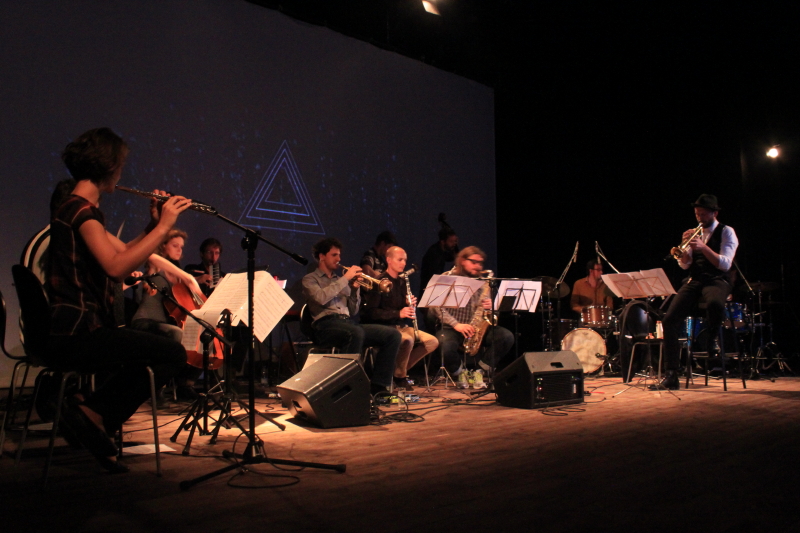 Na zamknięcie trzeciej edycji FONOMO wystąpiła tradycyjnie, jak co roku stworzona na tę okazję FONOMO Orkiestra. Trzydniowe warsztaty lokalnych artystów pod przewodnictwem zaproszonego muzyka wieńczą festiwal finałowym występem. Tym razem rolę lidera orkiestry objął trębacz Tomasz Dąbrowski silnie związany z duńską sceną muzyki improwizowanej. Orkiestra łącznie z Dąbrowskim liczyła 13 muzyków, co siłą rzeczy przełożyło się na potężne brzmienie i rozmach. Kompozycja, którą artyści zaprezentowali miała dosyć czytelną strukturę, wykorzystującą motywy ilustracyjne, nieco filmowe sekwencje melodyczne, płynnie przeplatając je bardziej złożonymi fragmentami granymi w podgrupach, czy wspólnymi, energetycznymi erupcjami. Muzycy nie uciekali również od przyjemnego big bandowego groove’u, który w przeciągu występu pozwalał artystom na złapanie większej swobody wykonawczej, chociaż w dalszym ciągu była to gra bardzo zdyscyplinowana. Dąbrowski jako lider sprawiał wrażenie jakby miał bardzo wyraźną wizję całości i precyzyjnie prowadził skład, a jednocześnie nie dominował nad zespołem jako solista, stawiając bardziej na demokratyczną relację pomiędzy artystami. Zgranie muzyków zrobiło na mnie duże wrażenie, a różnorodność brzmień jaką zaprezentowali w przeciągu około godzinnego występu nie dopuszczała wrażenia nudy. Zdumiewająco dobry rezultat biorąc pod uwagę stosunkowo krótki okres wspólnej pracy. Osobne brawa należą się Adamowi Krukowi odpowiedzialnemu za niekonwencjonalne, groteskowe wizualizacje towarzyszące występowi orkiestry (co ciekawe zadedykowane Jacques’owi Lacanowi). Artysta świetnie wpisał się w muzykę kilkunastoosobowego składu, nadając jej ciekawy, narracyjny background.