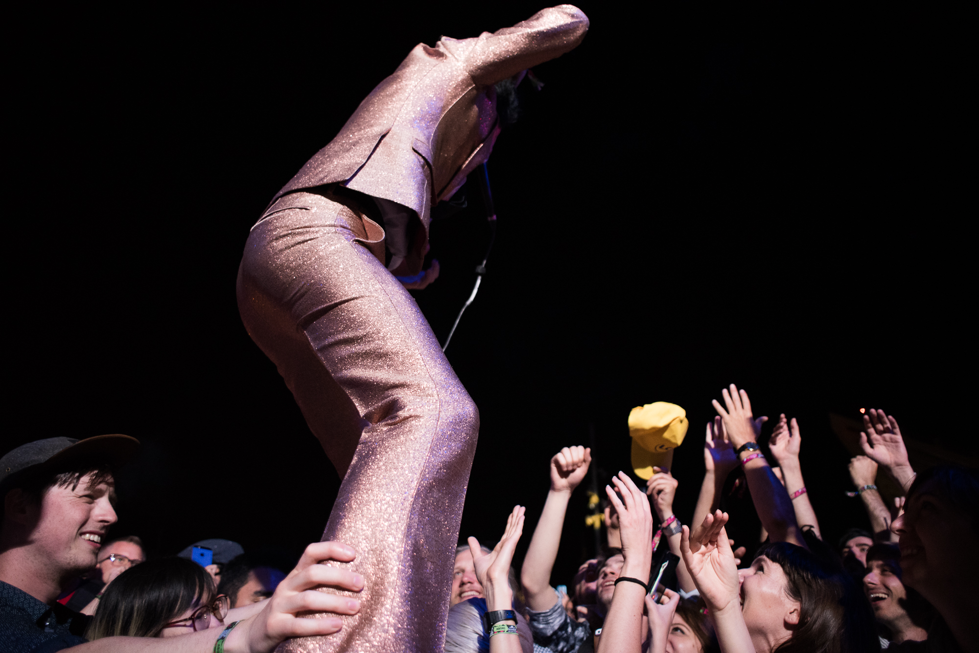 Kilka z koncertów widzianych na Primaverze zapamiętam do końca życia, że z samego szczytu wspomnę tylko Sleater-Kinney czy choćby podwójnie Swans (materiał zarejestrowany w ramach Not Here/ Not Now oraz prawie trzy godzinne katharsis w sali Auditori). I to właśnie kosztem Swans trafiłem na ten kolejny, który na pewno znajdzie się w TOP5 barcelońskiej imprezy. Ladies and Gentlemen: The Make-Up. Ian Svenonius, który 4/5 występu spędził wśród publiczności nie zwracał uwagi na okoliczności czy warunki w jakich może w niej funkcjonować. Chodził po ludziach, depcząc po ramionach, tańczył, prowokował, wymachiwał rękoma, wyprawiał cuda z mikrofonem. Był w obłędnym transie, ale co najważniejsze jego wokale był idealne. Stękanie, jęki, czysty - klasyczny śpiew, krzyk. Niebywałe sceniczne ego... Greg Puciato z Dillinger Escape Plan, Jehnny Beth z Savages czy była frontmanka Crystal Castles Alice Glass lubili pobyć w tłumie, ale na trochę innych zasadach. Po pierwsze szukali odpowiedniego miejsca. Po drugie czasami tracił na tym wokal. Po trzecie robili to tylko przy wybranych utworach. Svenonius oto nie dbał. 100% szaleństwa, opętania i co najważniejsze bez wokalnych strat! Geniusz. Koncertowy maestro. No i basistka Michelle Mae... To już osobny temat. Oaza spokoju i elegancji. Trzymająca wszystko w swoich rękach, prowadziła każdy z utworów, doskonale dobranej setlisty. Cały zespół fantastycznie zgrany, było głośno, czysto, słowem fenomenalnie! „I Am Pentagon”, „We're Having a Baby”, „Here Comes The Judge”, „Wade in the Water”, „Walking on the Dune”, no a przede wszystkim „Blue Is Beautiful” i „We Can't Be Contained”. Szczytowe doświadczenie – prawdziwy koncertowy knock out.