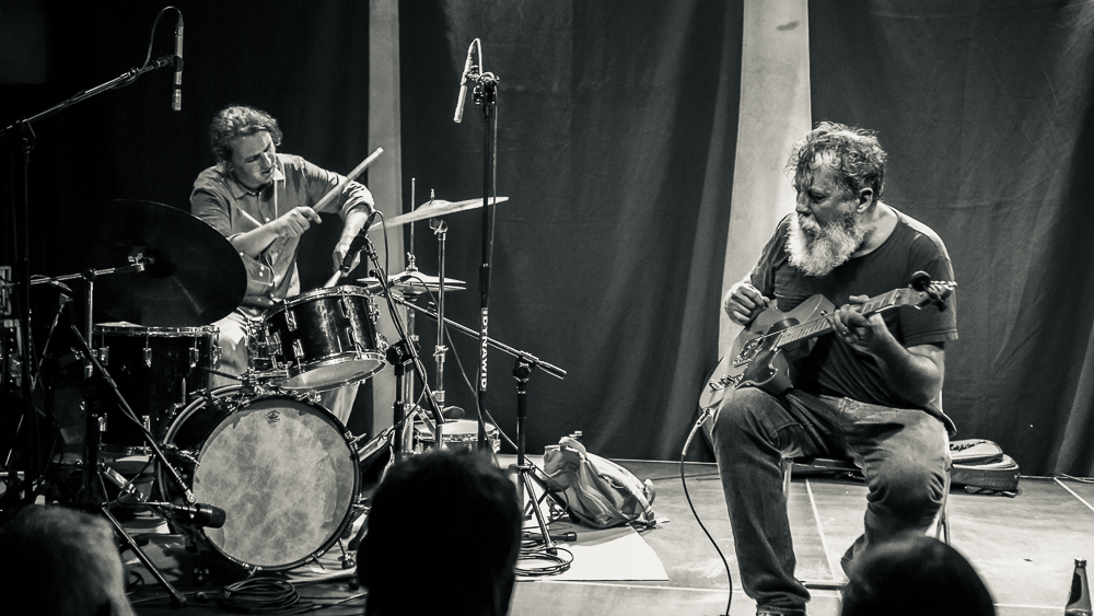 Głównym wydarzeniem wieczoru był dla mnie jednak drugi koncert. Bardzo dobrego free jazzu było jednak na deskach Pardon więcej (i w ogóle w Warszawie) więcej niż eksperymentalnej gitary. Bill Orcutt przyjechał do Warszawy po raz pierwszy, z gitarą elektryczną i stylem nieco innym niż szarpany, eksplozywny brutalizm, który cechował jego pierwsze solowe płyty. Jego aktualny styl jest jednak tylko trochę bardziej tradycyjny i melodyjny, a niezmiennie interesują go wiwisekcje tradycyjnych amerykańskich utworów (np. "White Christmas" i "Star Spangled Banner" w parze). W grze Orcutta dynamika była jeszcze większa, co dawało kapitalny efekt przy zgrzytliwych dekonstrukcjach utworów. Po czterech utworach zagranych solo, do Orcutta dołączył Paweł Szpura. Nie przypominam sobie, żebym wcześniej widział Szpurę zaprzęgniętego do takiej intensywnej galopady i grającego tak mocno. No ale po płytach Orcutta i Chrisem Corsano można było się domyślić, że w duetach chodzi mu w dużej mieze o energię. Improwizacja Orcutta ze Szpurą wypadła doskonale, to było naprawdę mocne, czujne, pełne zwrotów granie.