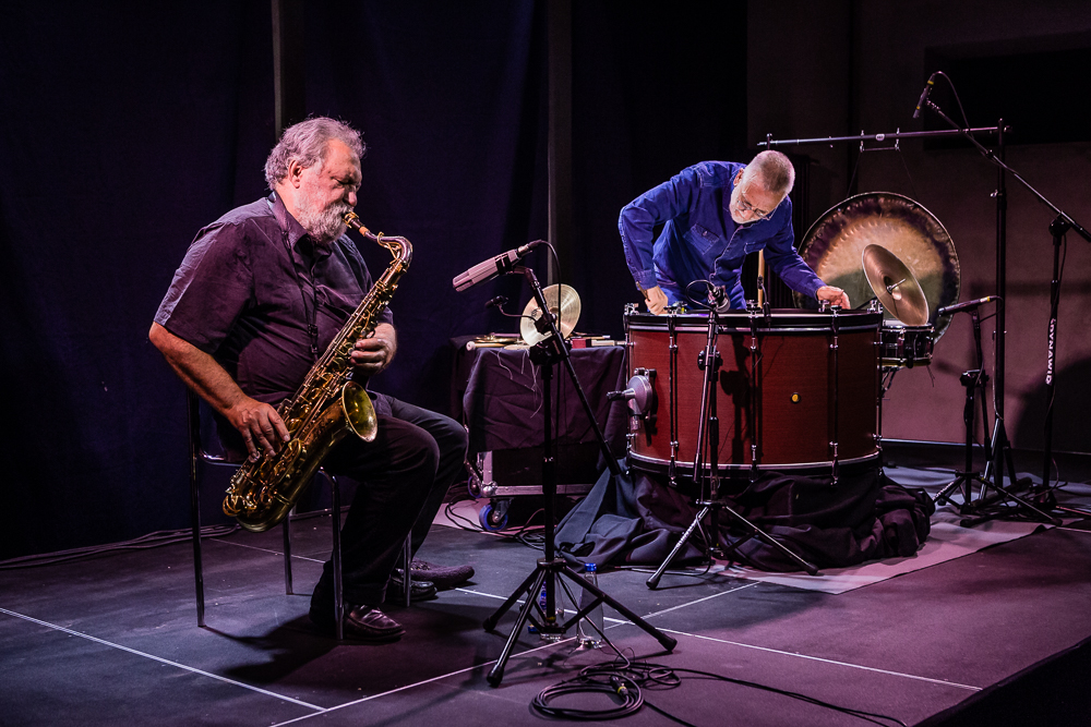 Po najgłośniejszym koncercie tego sezonu w Pardon, jaki zagrał Bill Orcutt, następny koncert był najcichszym. Evan Parker i Eddie Prévost grali czasem wręcz na granicy słyszalności, choć z dużą dynamiką i świetną amplifikacją, prezentującą jak pod mikroskopem każdy detal brzmienia. Ich czujne, skupione improwizacje takiego precyzyjnego brzmienia wymagały. To była muzyka sonorystycznie frapująca, ale zwiewna, nie przeintelektualizowana, meandrująca z dużą muzykalnością. Rewelacyjny koncert.
